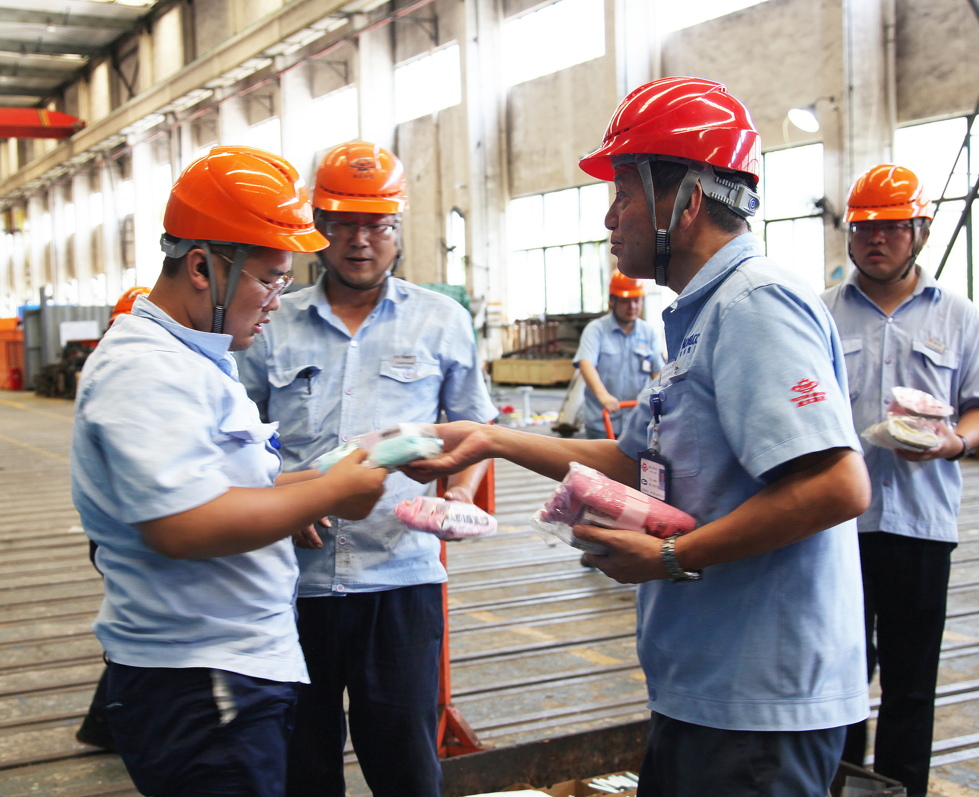 其中,在錫壓股份總裝車間,各工段員工正忙碌有序地開展工作中?!靶量嗔?!”李董一行向奮戰(zhàn)在高溫下的一線員工表示感謝和問候,貼心地為他們送上防暑降溫用品,再三叮囑員工在全面推進項目進度的同時,更要注意防暑降溫。